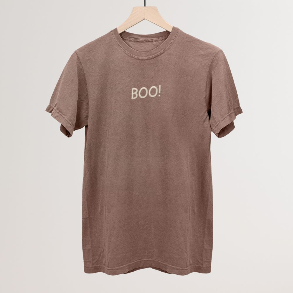 Keep it spooky and simple with our “Boo!” embroidered Comfort Colors® tee. Featuring playful, minimalist embroidery on the chest, this tee is the perfect way to celebrate Halloween with a subtle yet festive touch. The soft-washed Comfort Colors fabric gives it that perfectly worn-in, vintage feel right from the first wear—ideal for cozy fall days, haunted hayrides, or handing out candy on Halloween night. This item comes in two full-length color ways—ivory and espresso.