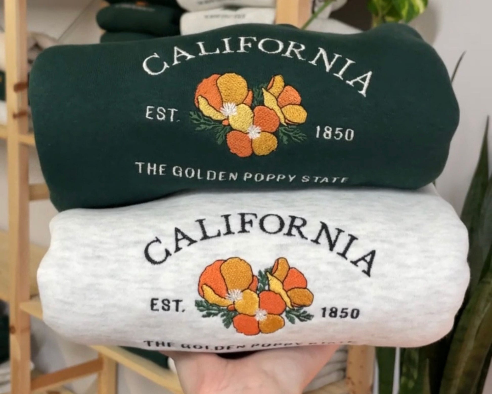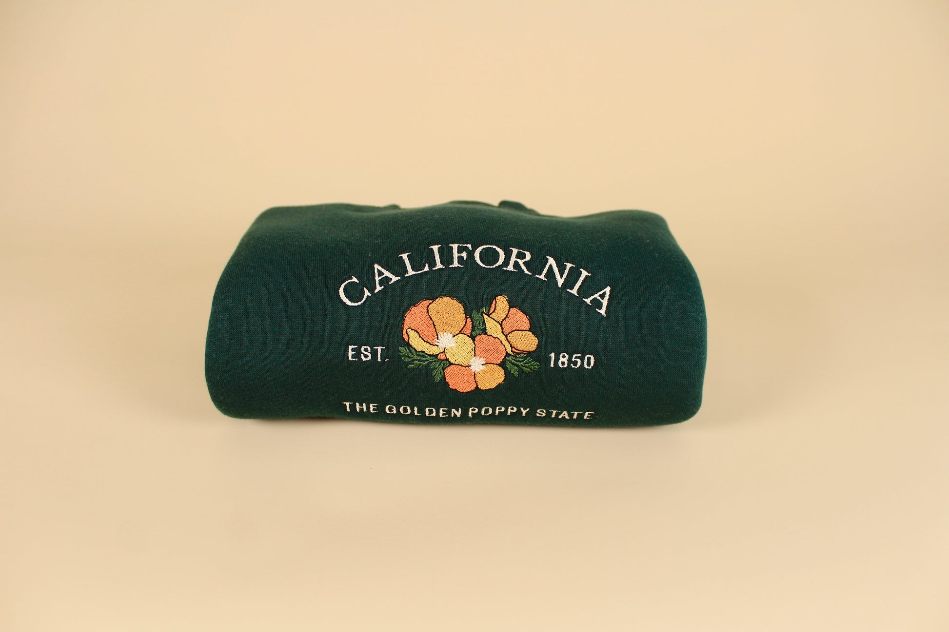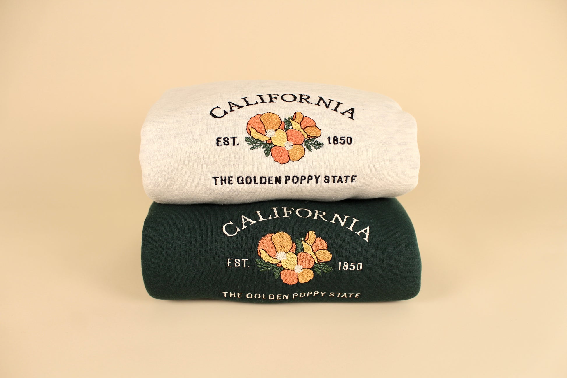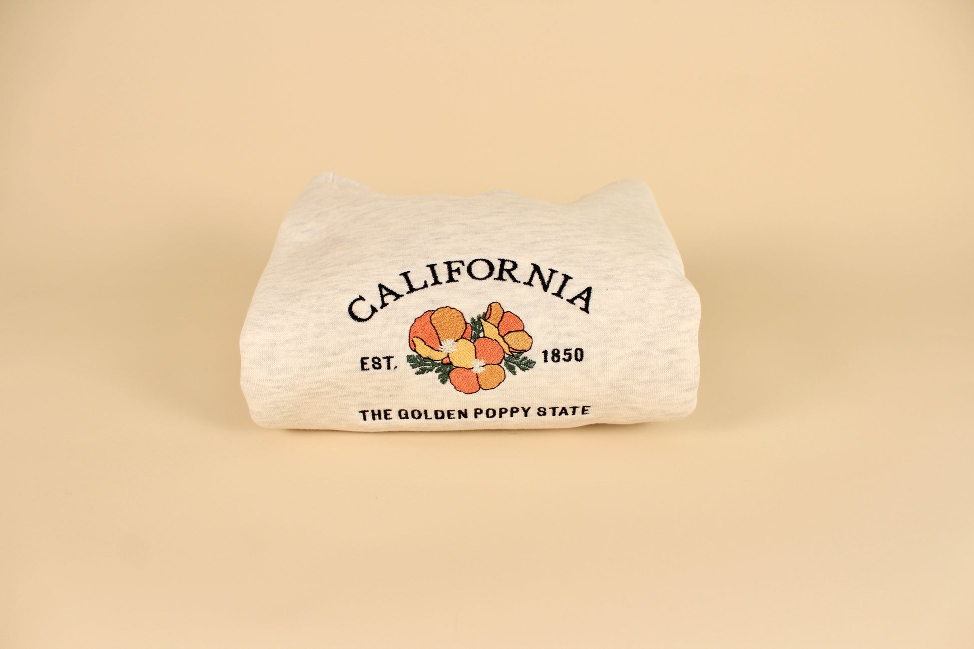 Inspired by the vibrant beauty of California’s golden poppy fields, this uniquely embroidered sweatshirt features an intricate floral design that brings the state flower to life. See sizing and material details below.