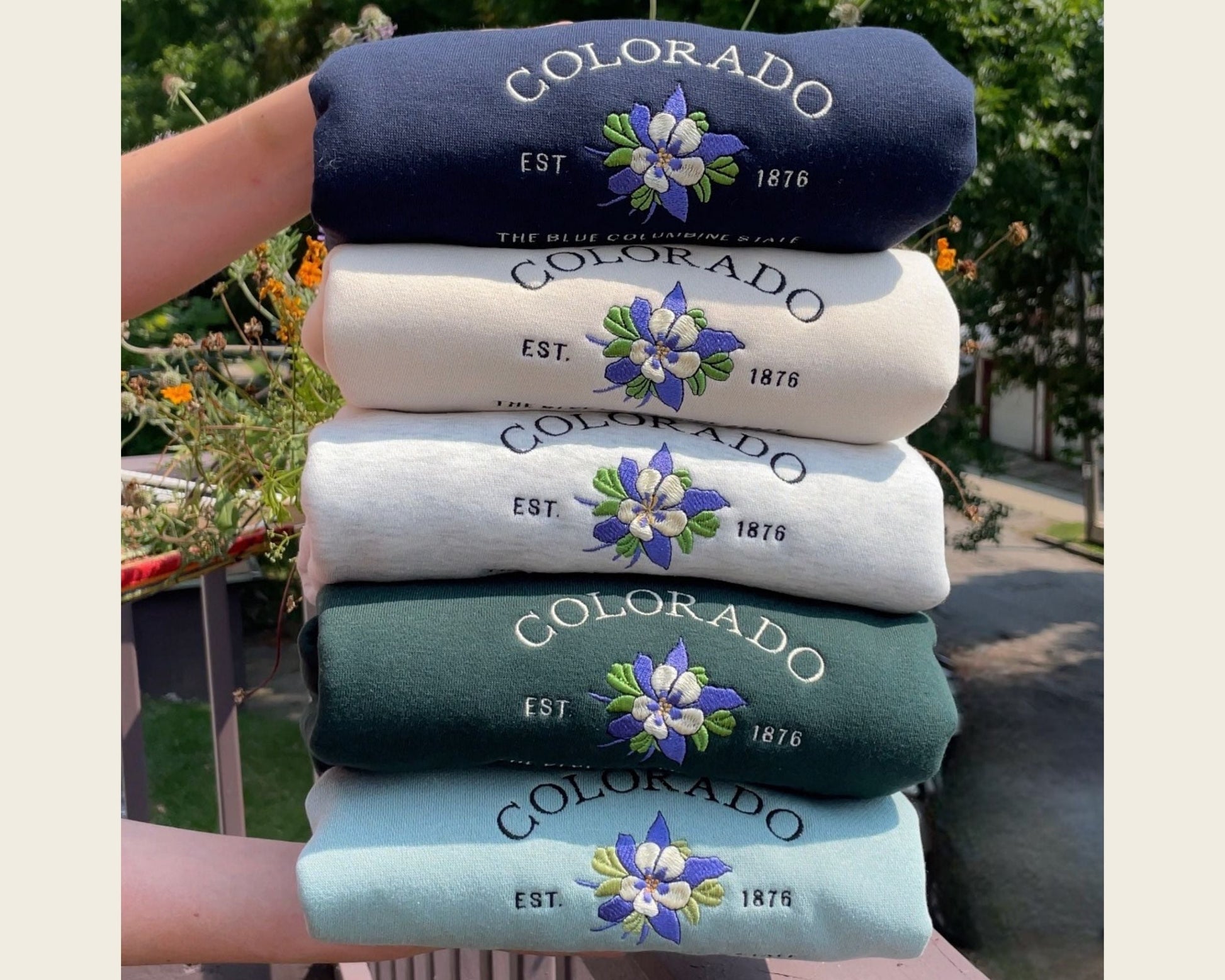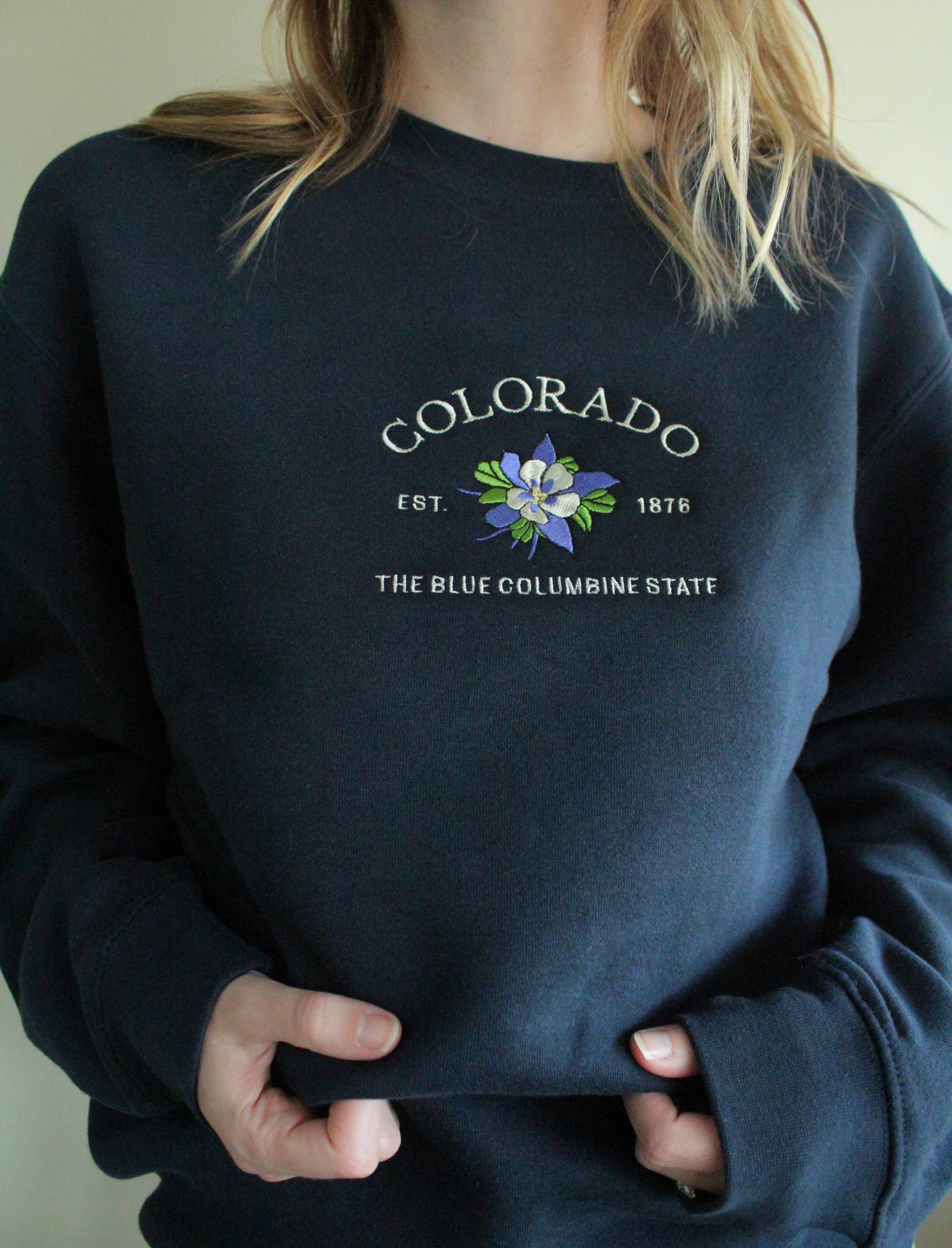 Inspired by the vibrant beauty of the Rocky Mountains, this uniquely embroidered sweatshirt features an intricate floral design that brings the Colorado state flower to life. See sizing and material details below.