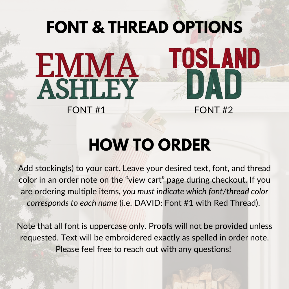 Make your holiday season even more magical with a one-of-a-kind Christmas stocking designed just for you. Each stocking is thoughtfully embroidered with your custom name, bringing a personal touch to your mantle, staircase, or holiday décor.