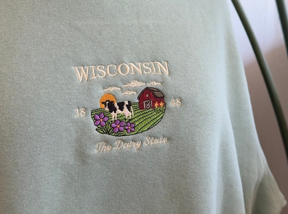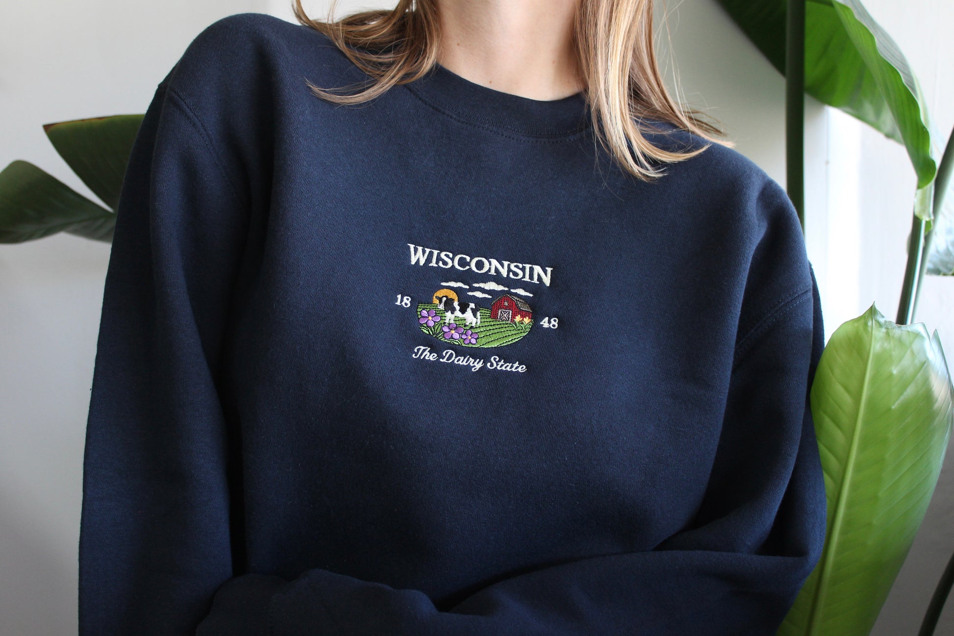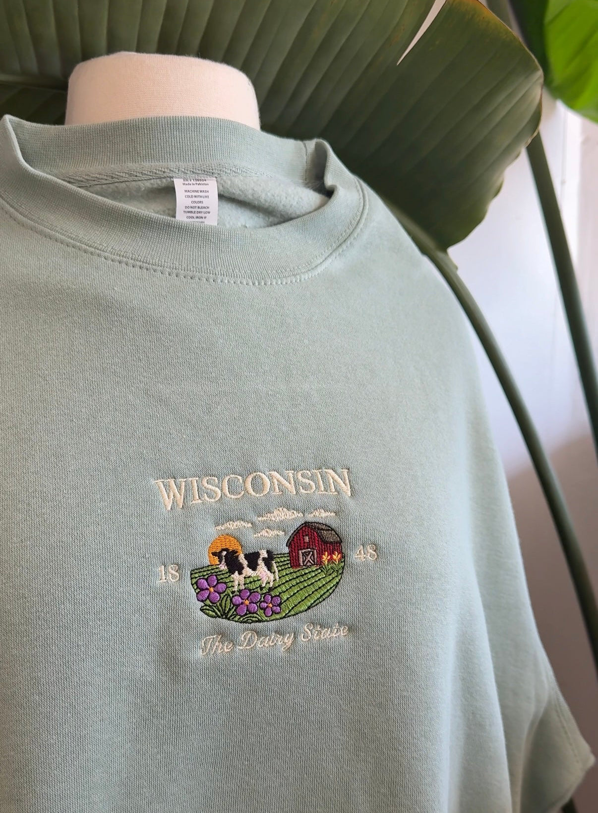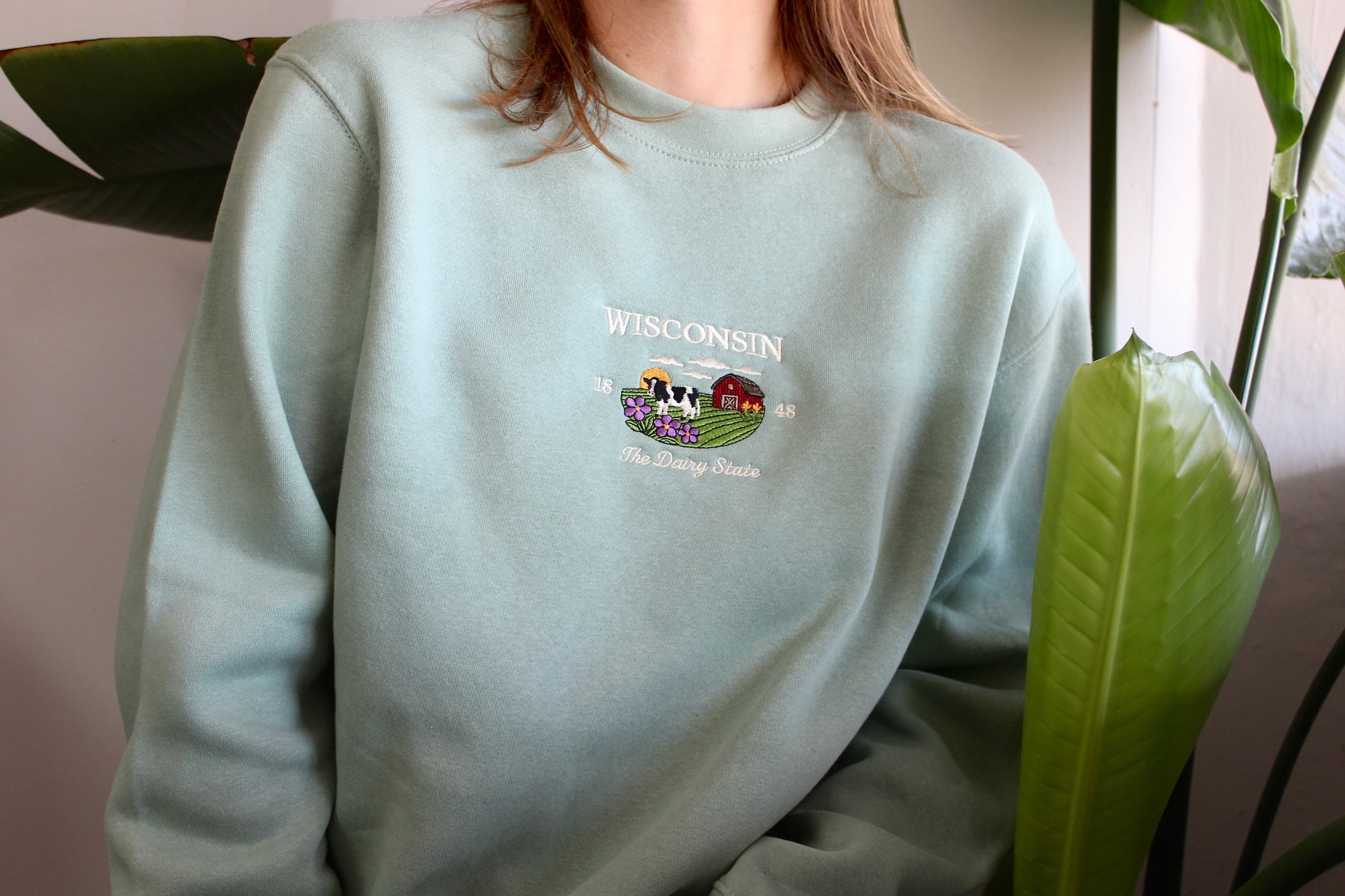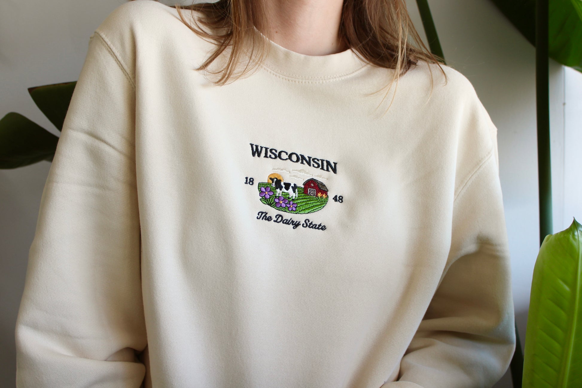 Celebrate the heart of the Dairy State with this cozy embroidered sweatshirt, featuring a charming cow and barn design that pays homage to Wisconsin’s proud farming roots. Thoughtfully stitched with fine detail, the design captures the warmth and heritage of rural life while offering a modern, everyday style.