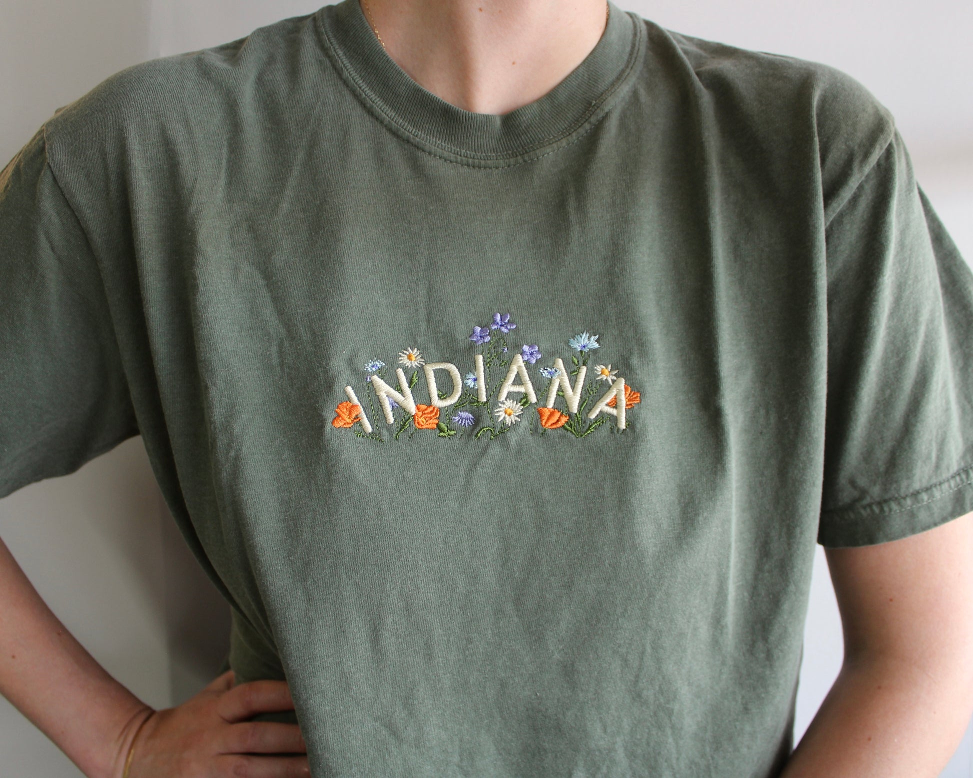 Celebrate the quiet beauty of the Hoosier State with our Indiana Wildflower Tee. Crafted from 100% ring-spun cotton and garment-dyed for that soft, worn-in feel, this Comfort Colors t-shirt features “Indiana” delicately embroidered and framed by wildflowers—bringing a touch of prairie charm and Midwest pride to your everyday wardrobe.