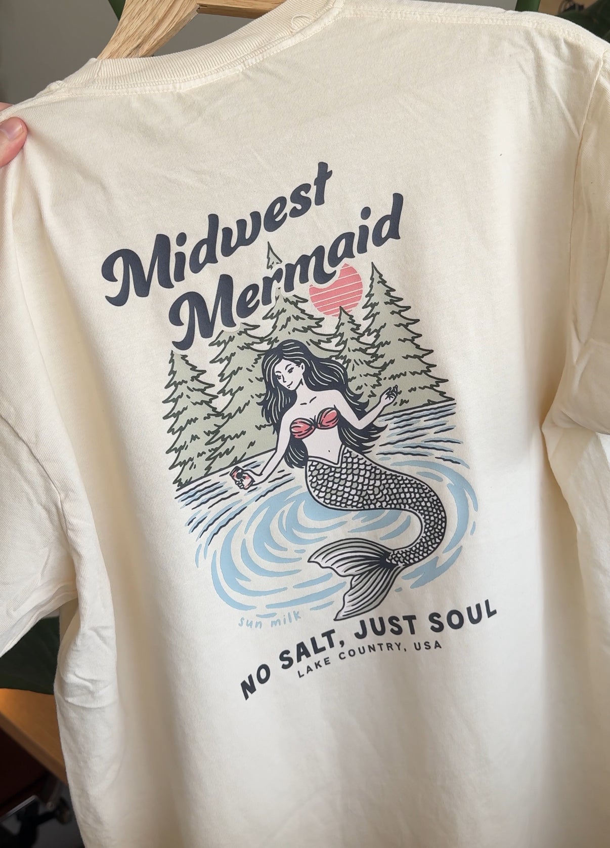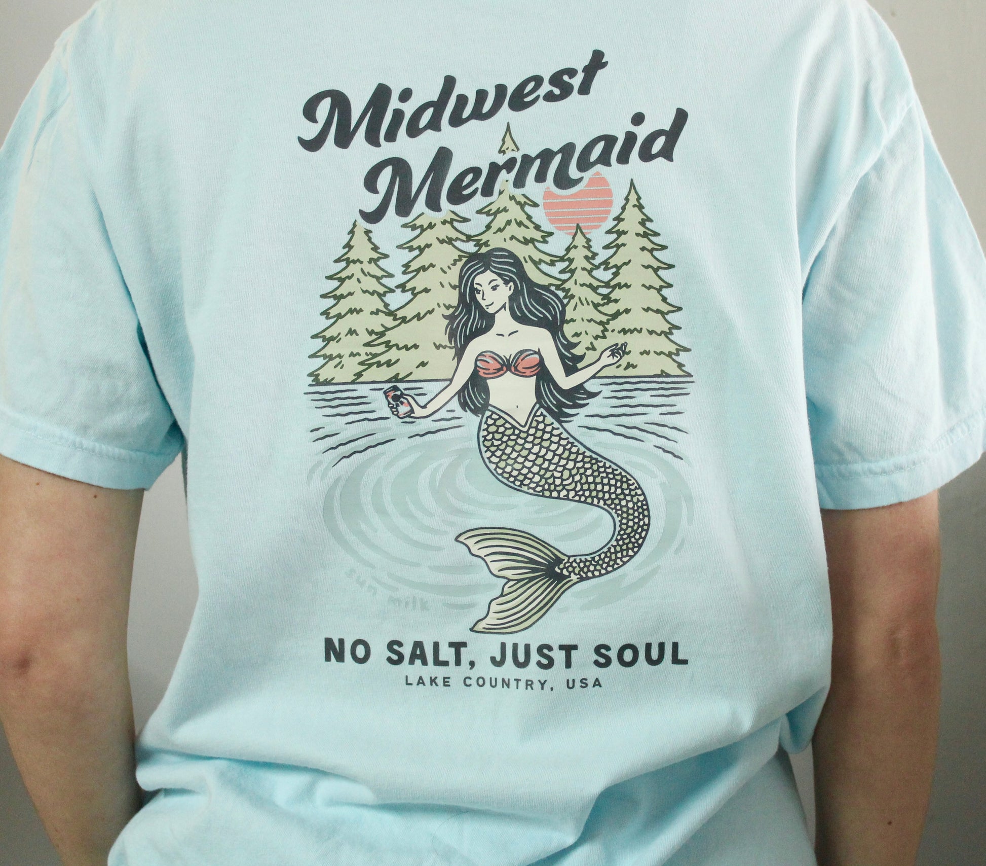 Celebrate lake days and laid-back vibes with our Midwest Mermaid Tee. Made from 100% ring-spun cotton and garment-dyed for that perfectly broken-in feel, this Comfort Colors t-shirt features detailed embroidery of “Midwest Mermaid” in playful, wavy lettering—bringing to life the carefree magic of sunny docks, sparkling water, and endless summer afternoons.