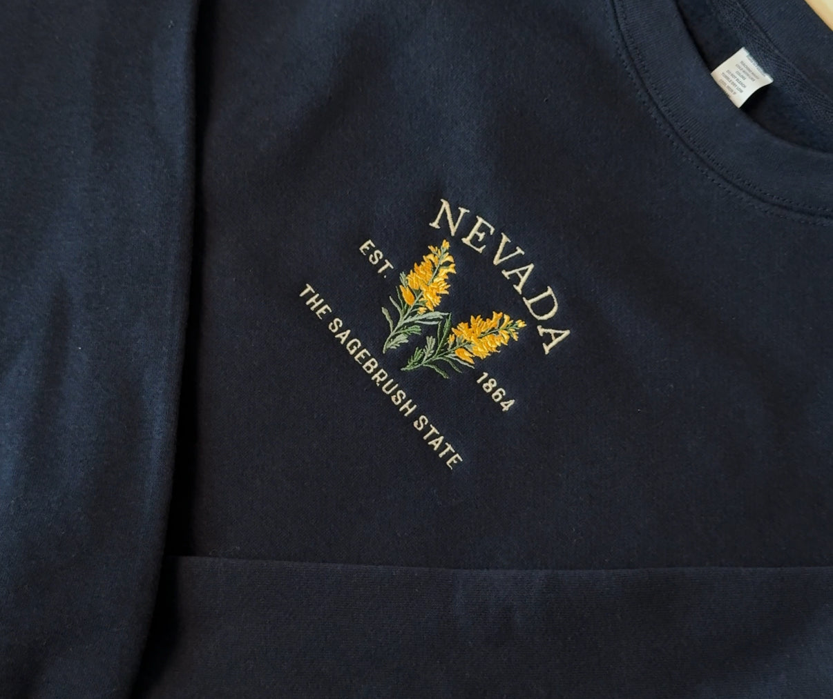 Celebrate the Silver State with this cozy embroidered crewneck featuring Nevada’s state flower — the sagebrush. Each stitch captures the muted greens and silvery tones of this resilient desert bloom, a symbol of endurance and wide-open western landscapes.