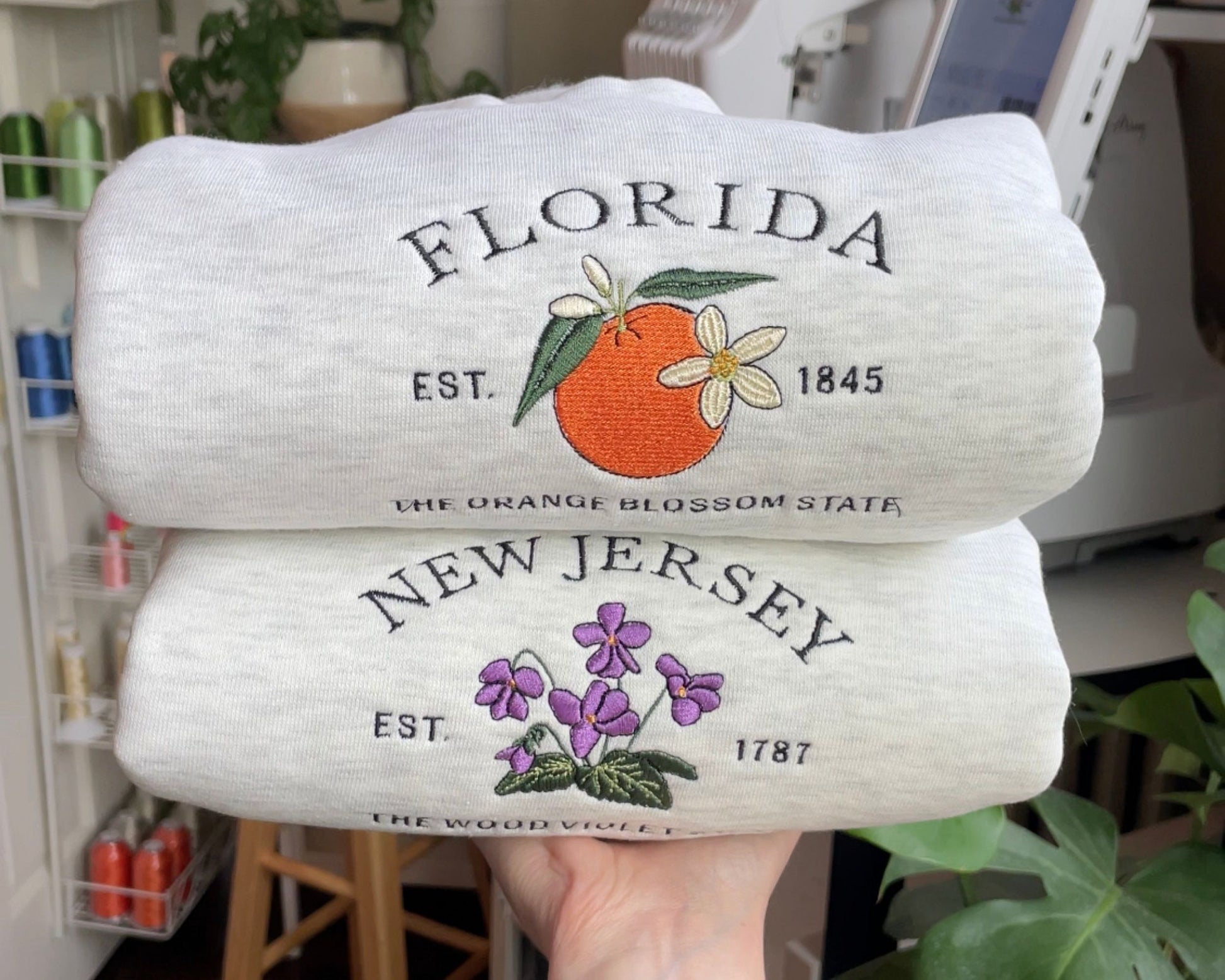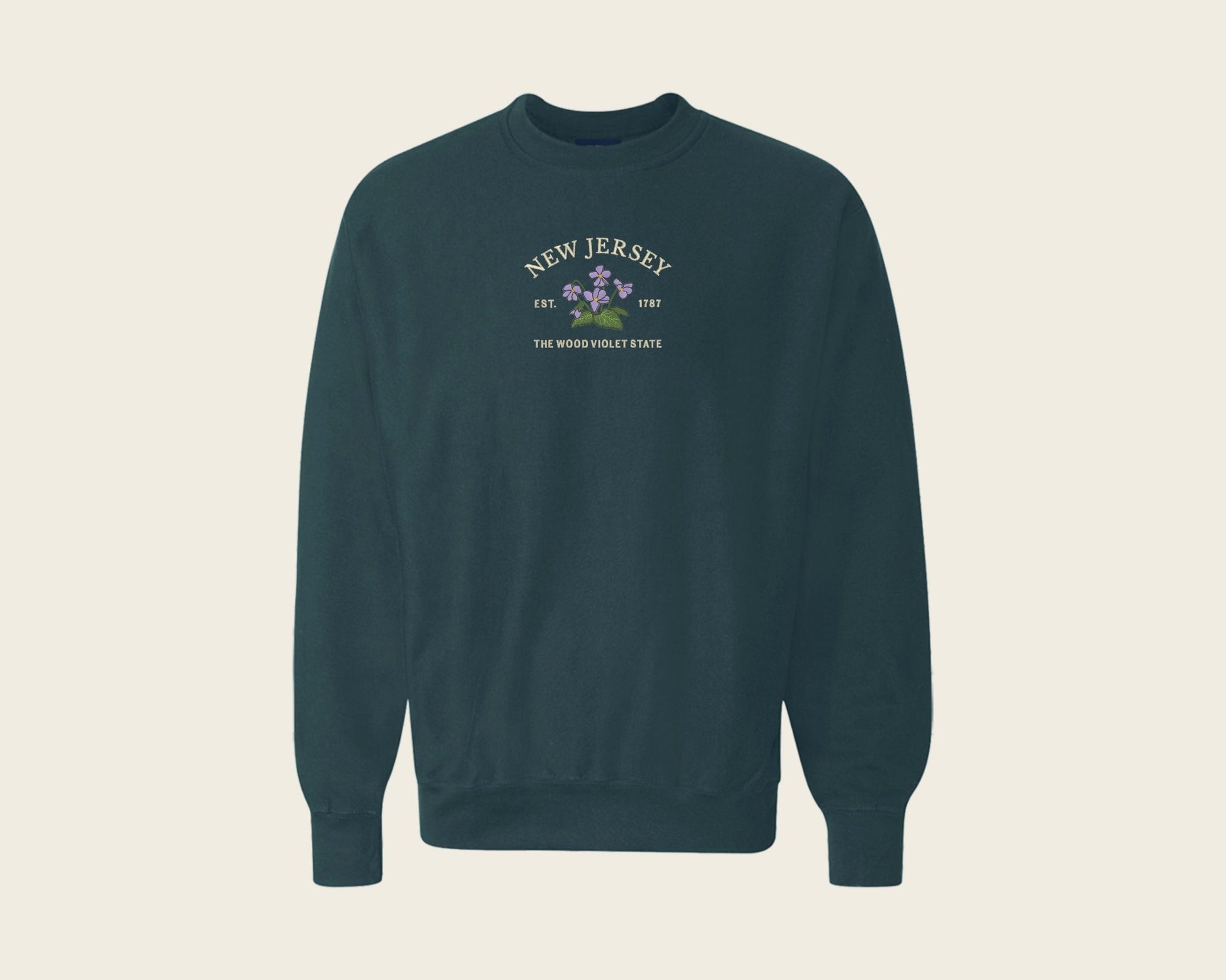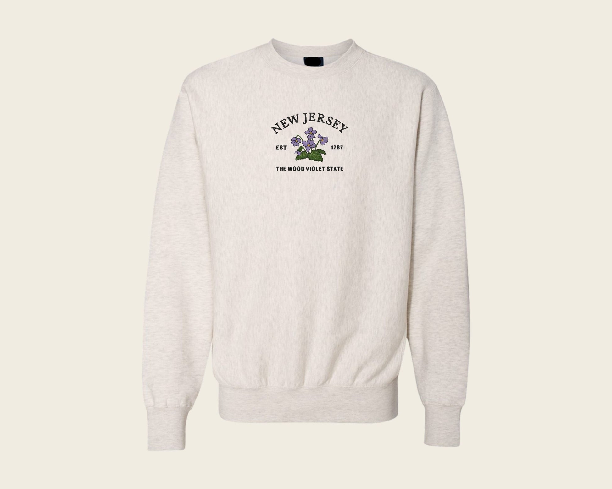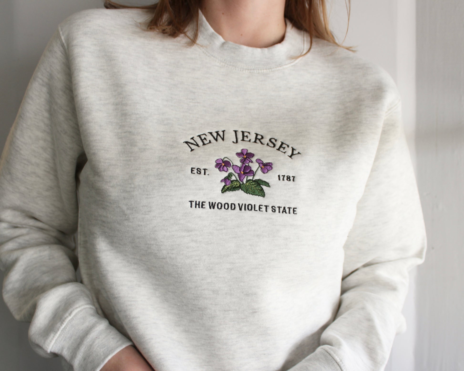 Inspired by springtime in New Jersey, this embroidered crewneck features a delicate design showcasing the state flower, the wood violet. See sizing and material details below.