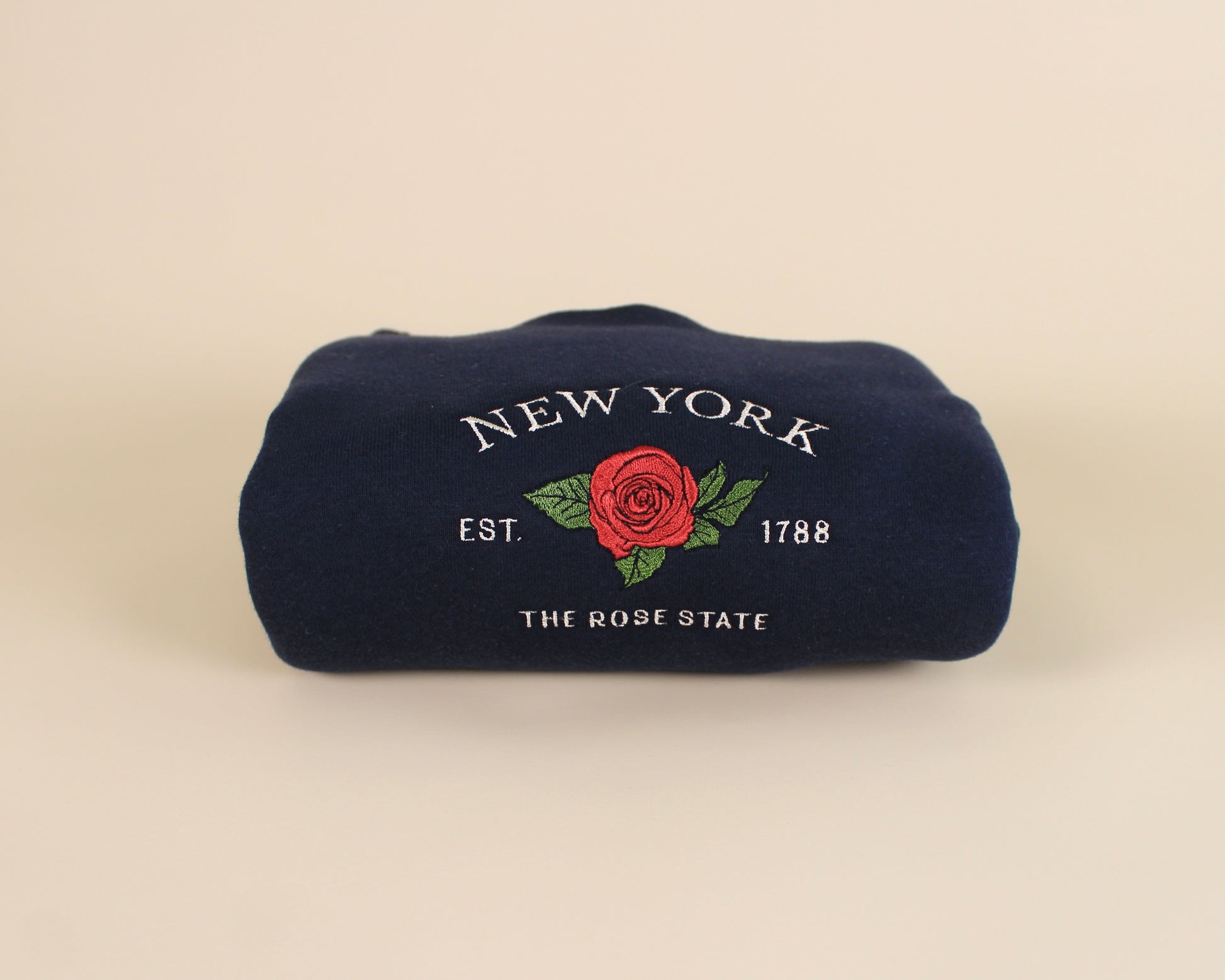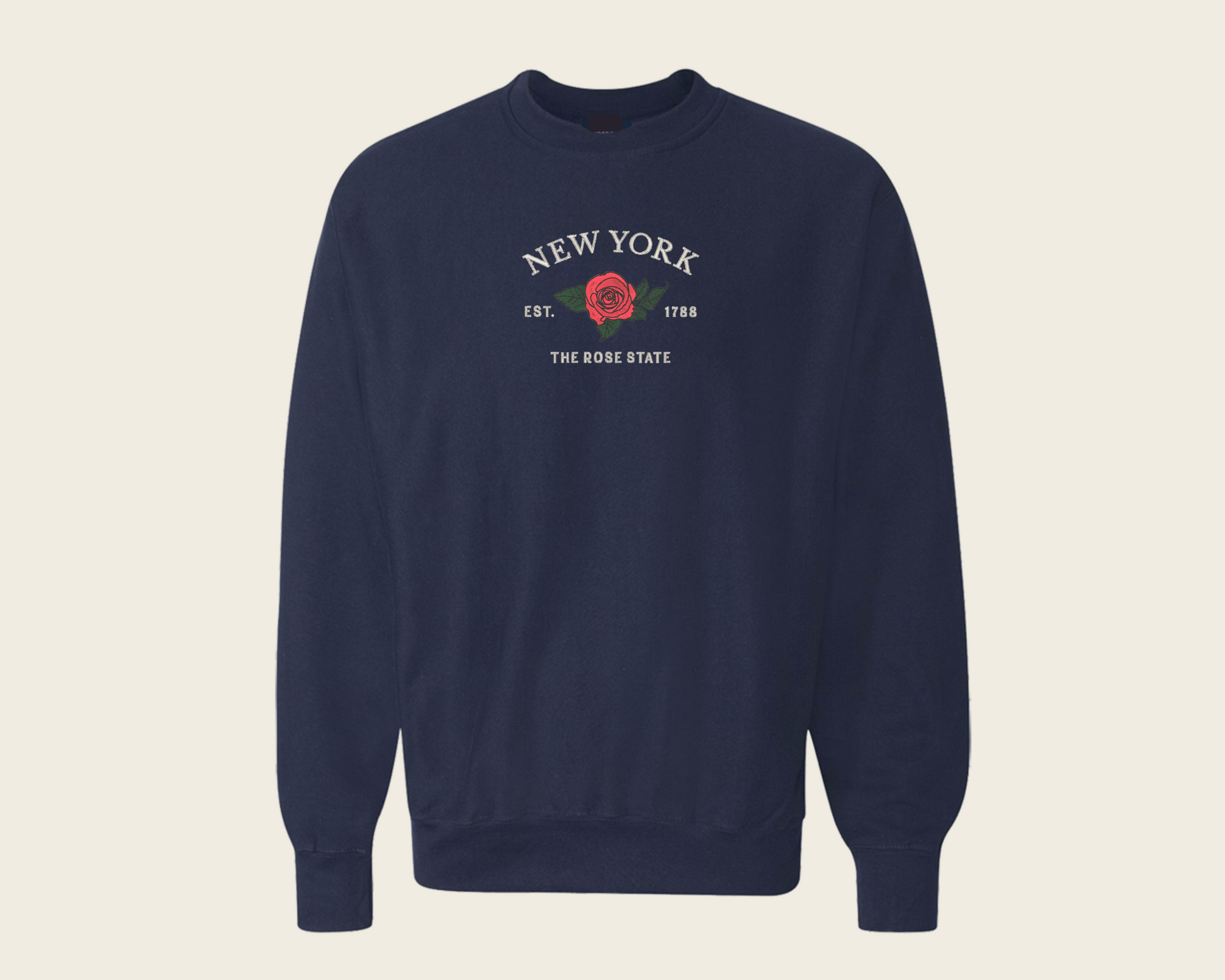 Cozy up in this thoughtfully crafted crew that features an intricately embroidered rose to represent New York's floral emblem. See sizing and material details below.