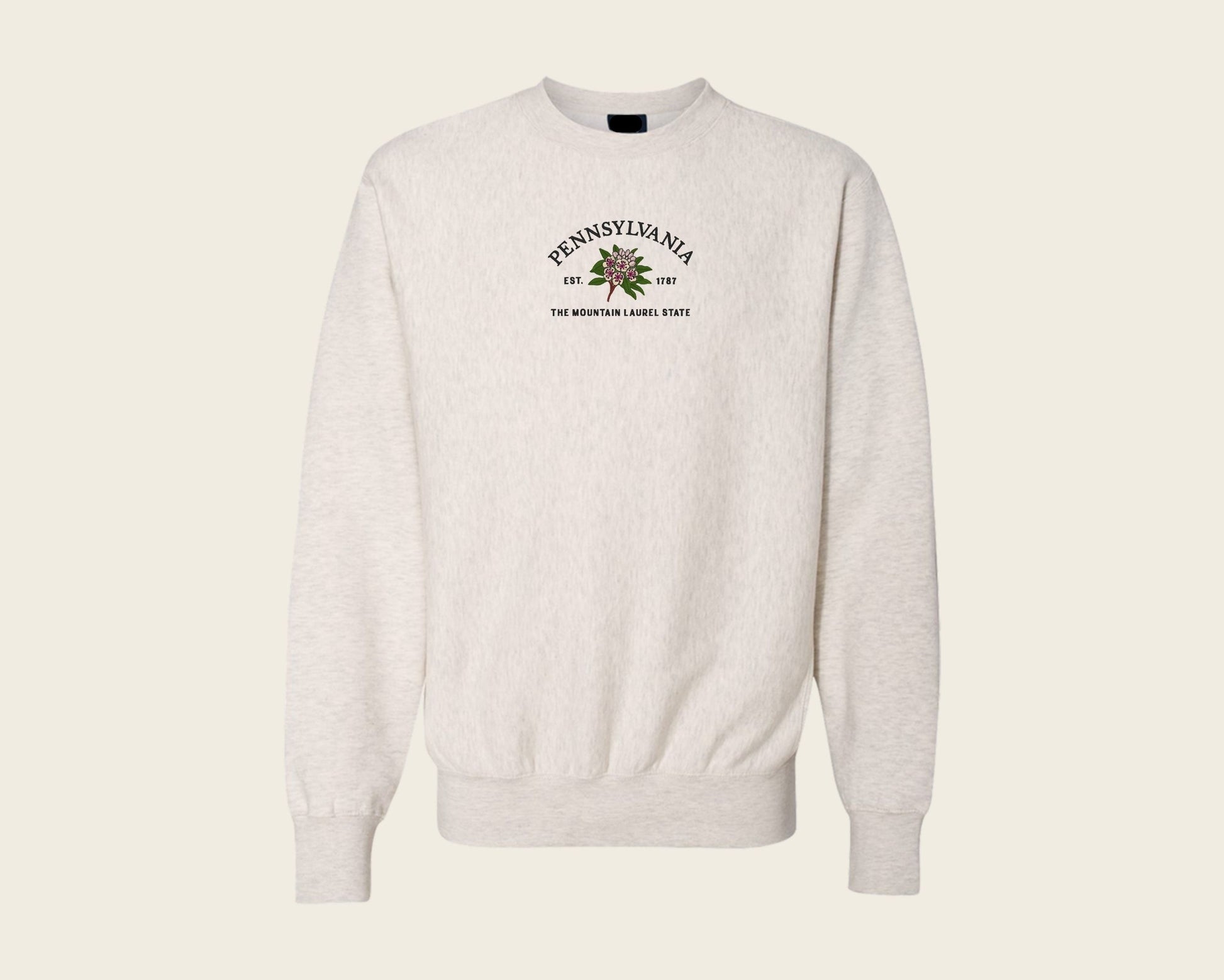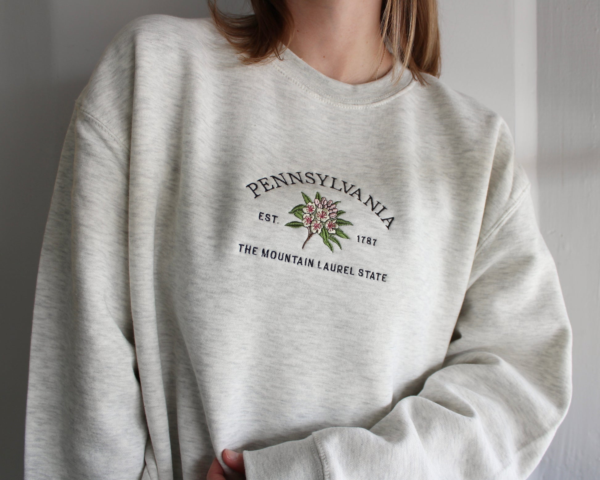 Inspired by this lush east coast state, this embroidered crewneck features a classic design dedicated to Pennsylvania's state flower, the mountain laurel. See sizing and material details below.