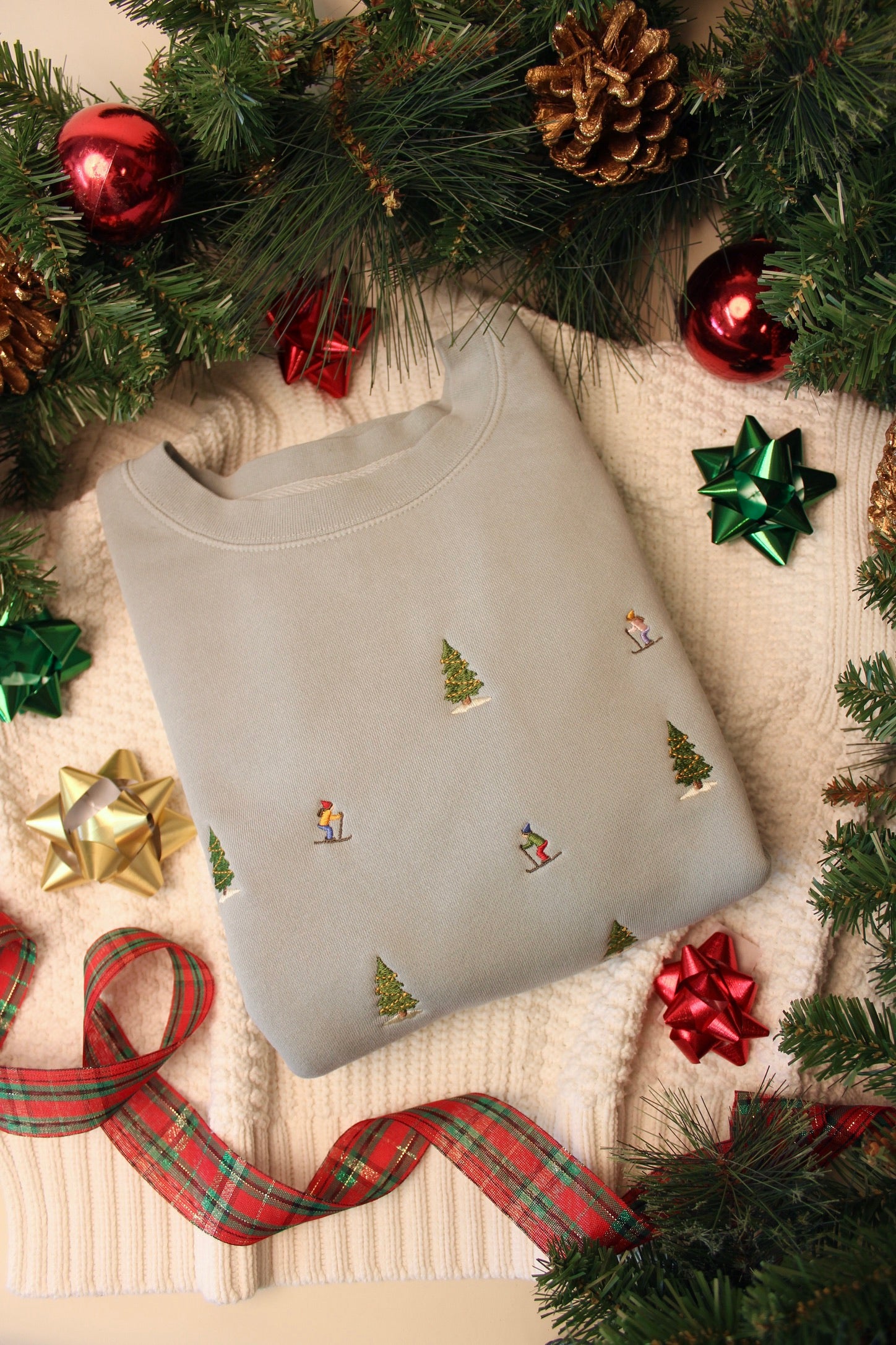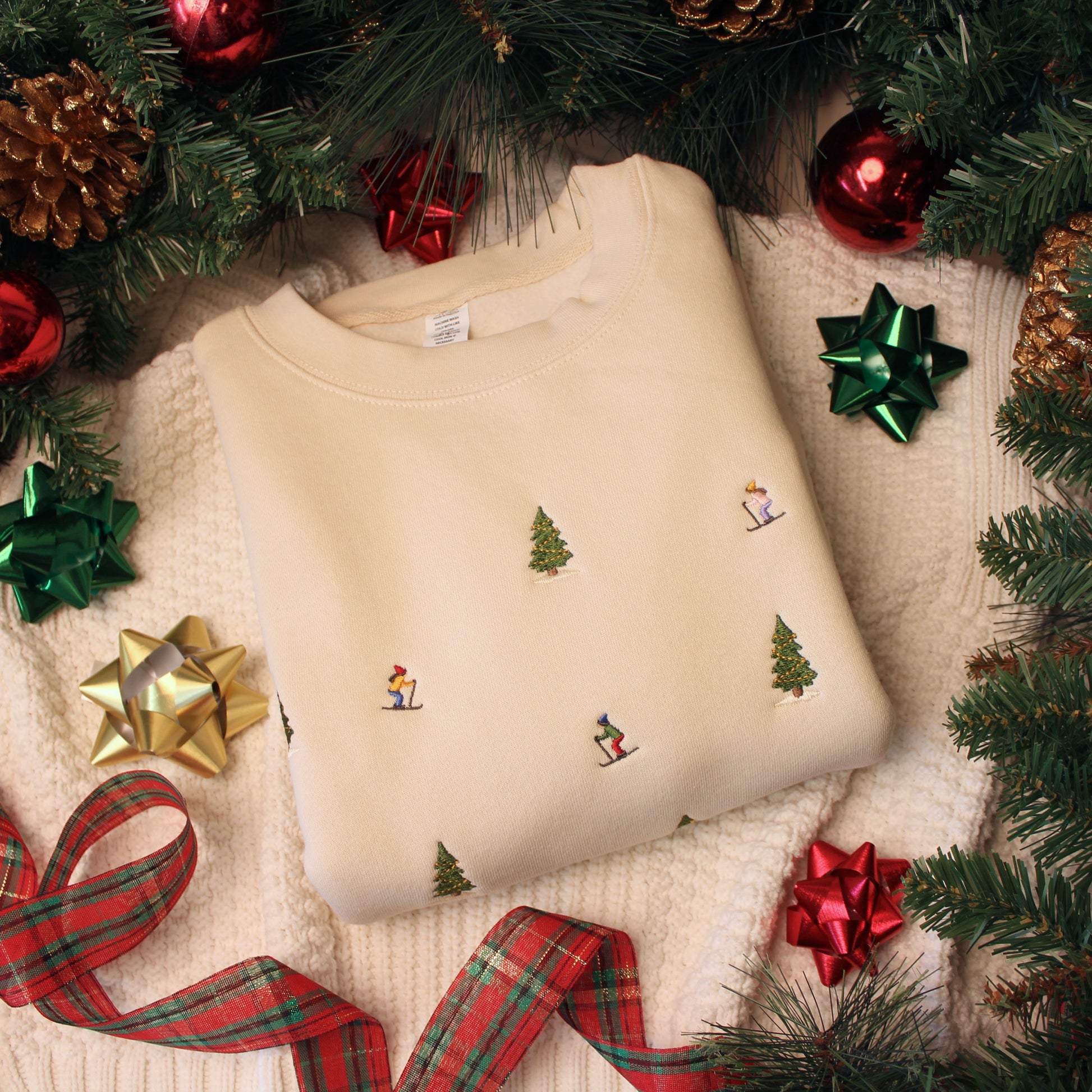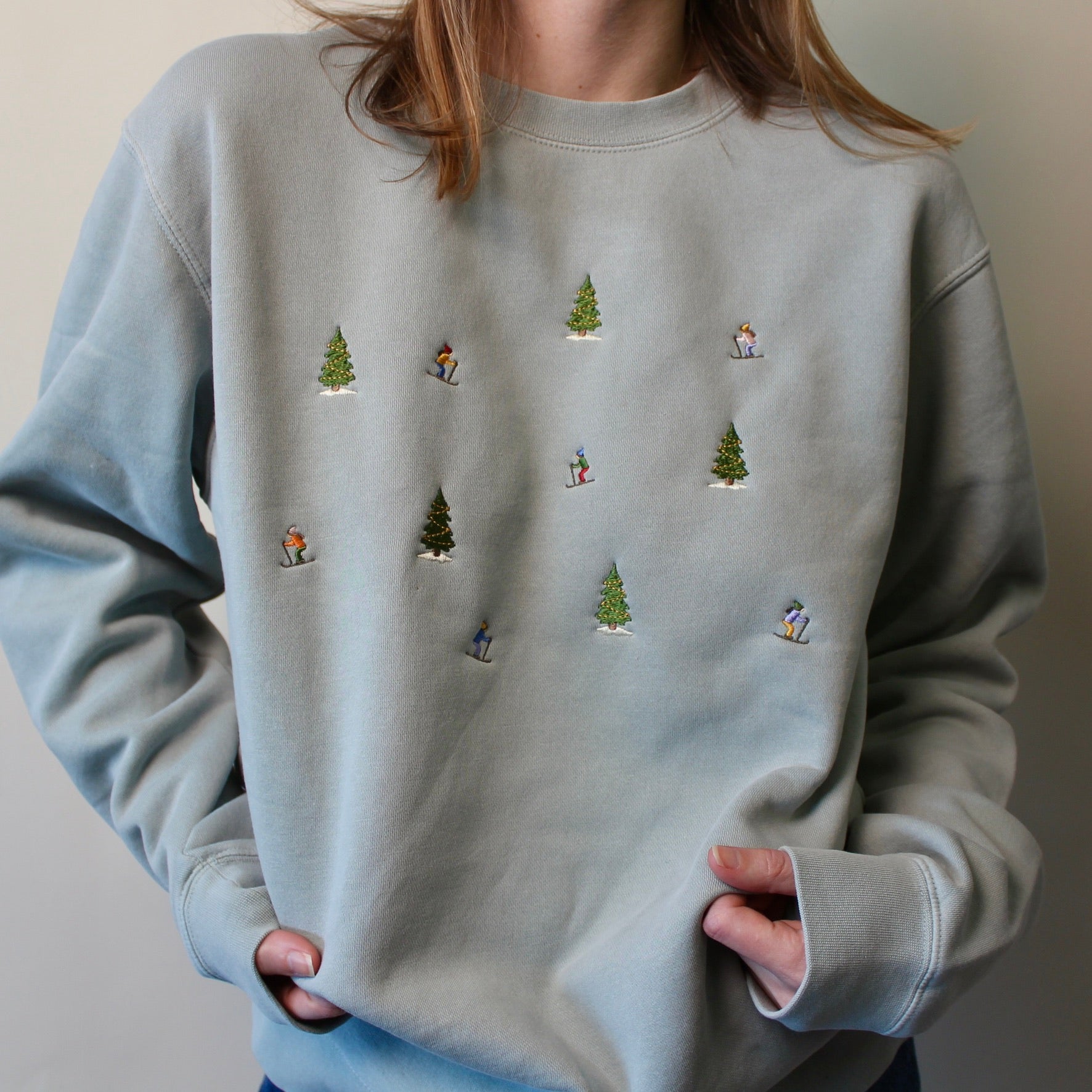 Hit the slopes without leaving home. This cozy crewneck features delicately embroidered skiers gliding down a snowy hillside, each one stitched with charming little details—from colorful winter outfits to tiny evergreens dotting the landscape. The design is subtle yet eye-catching, giving off a playful, vintage-inspired winter feel.