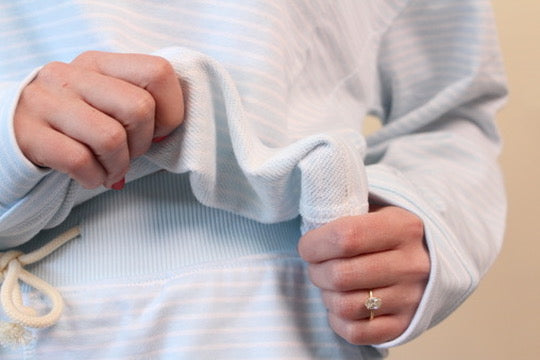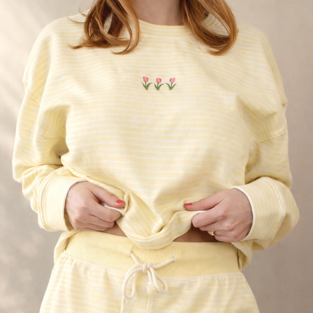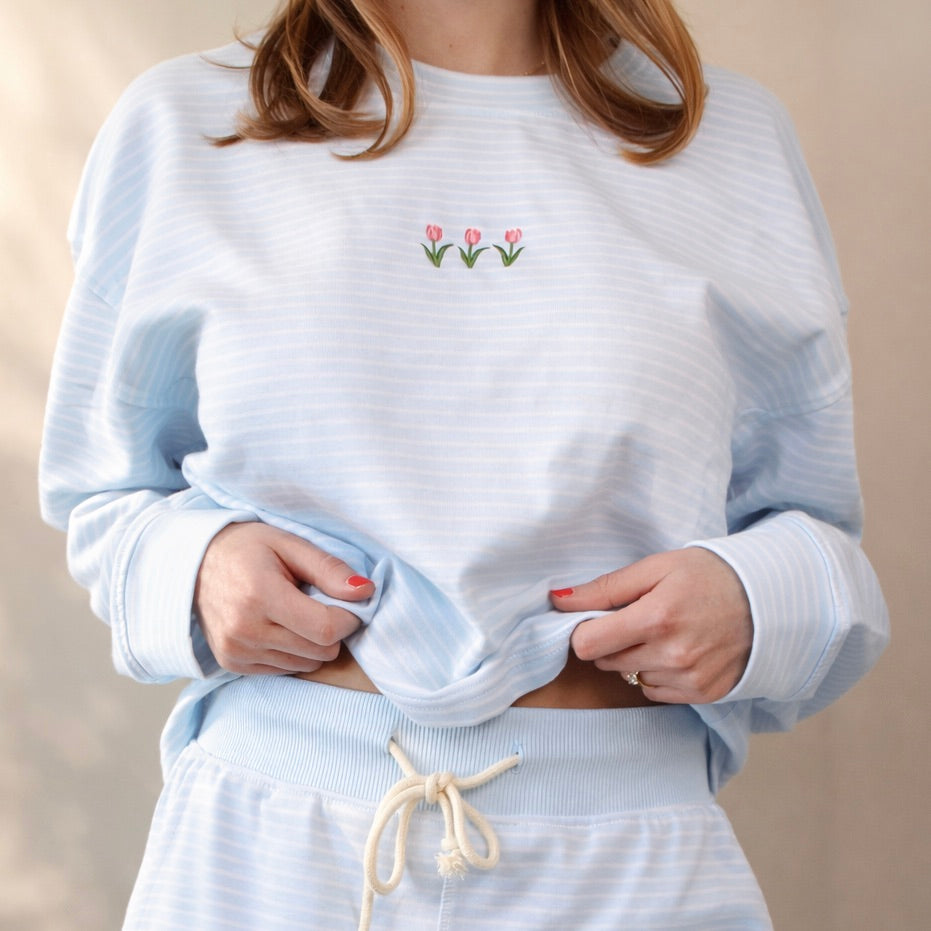 Cozy, effortless, and easy to style. This light blue and white striped crewneck is designed with three delicately embroidered tulips, adding a gentle floral touch to a relaxed silhouette. Lightweight with a boxy fit, this crew can be worn with something your already have in y our closet or you can pair it with the matching striped shorts for a coordinated look. Model (me, hehe!) is 5/6" and wearing a size small.