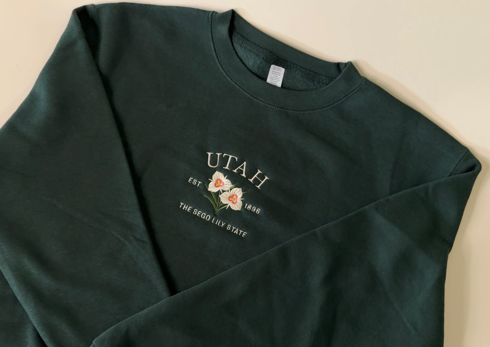 Inspired by the graceful beauty of Utah's state flower, this beautifully embroidered sweatshirt features a detailed sego lily design that celebrates this western state's natural charm. Designed for comfort and style, this piece is perfect for nature lovers and proud Missourians alike. See sizing and material details below!
