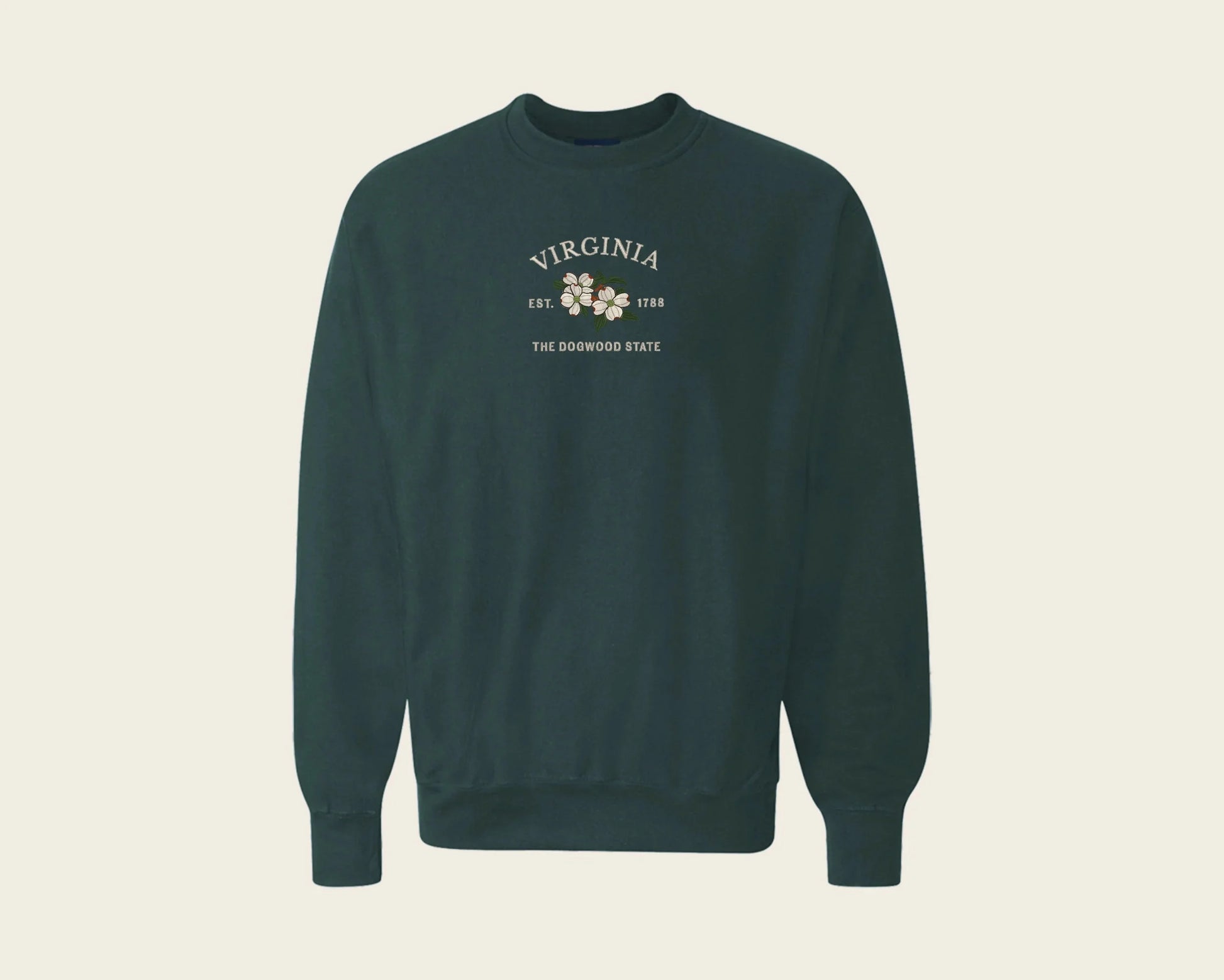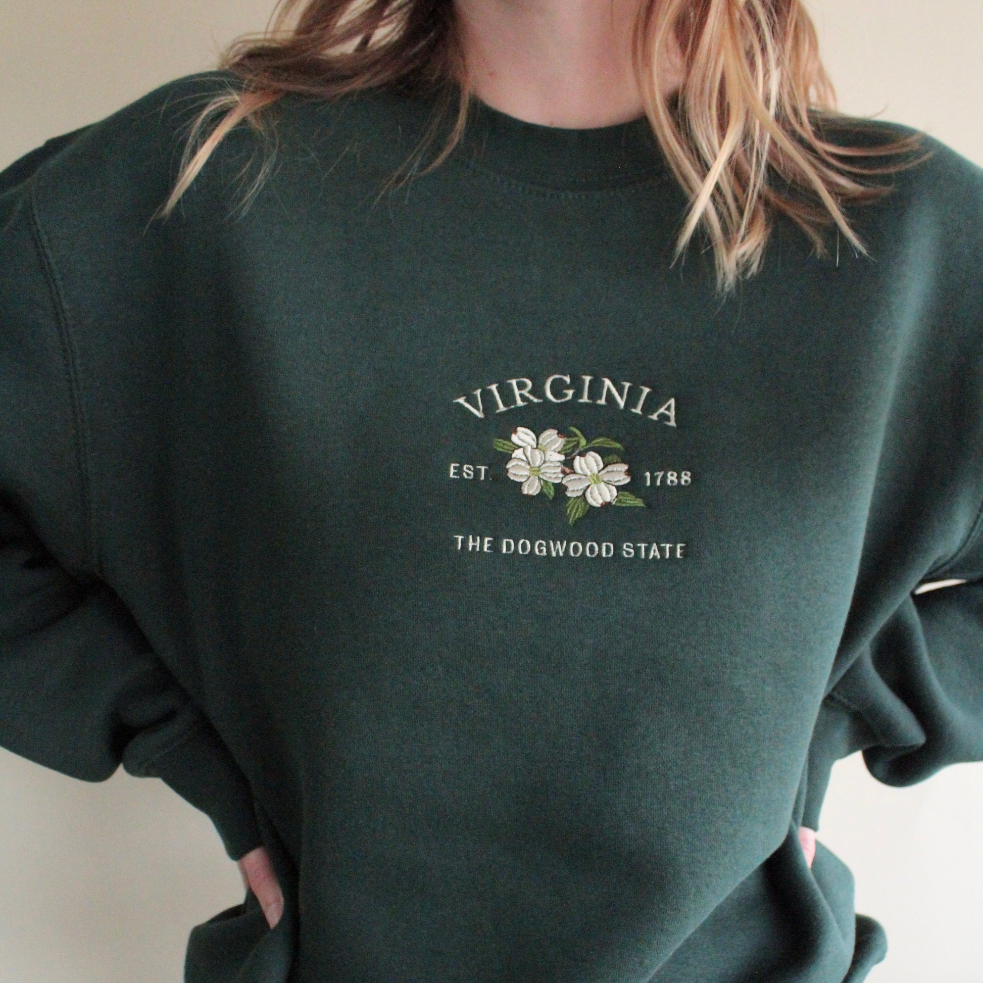 Inspired by the southern beauty of Virginia's flowering dogwood tree, this embroidered sweatshirt features a delicate floral design that brings the state flower to life. See sizing and material details below.