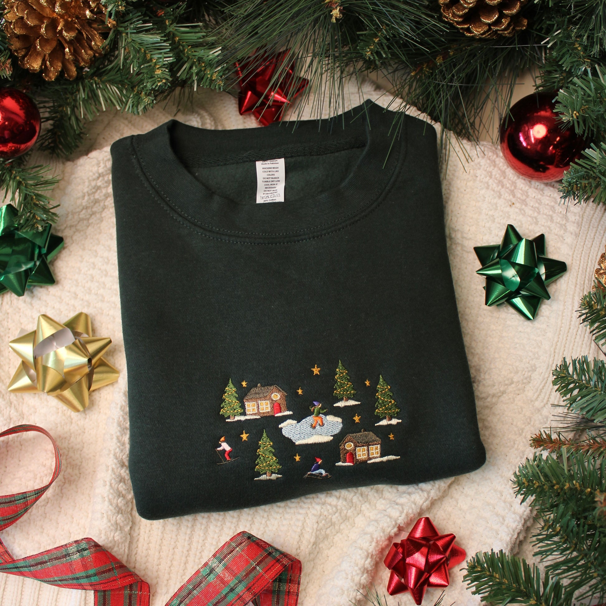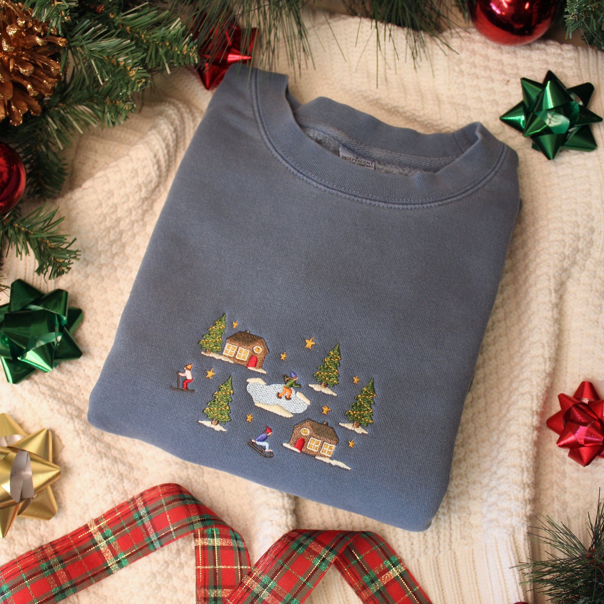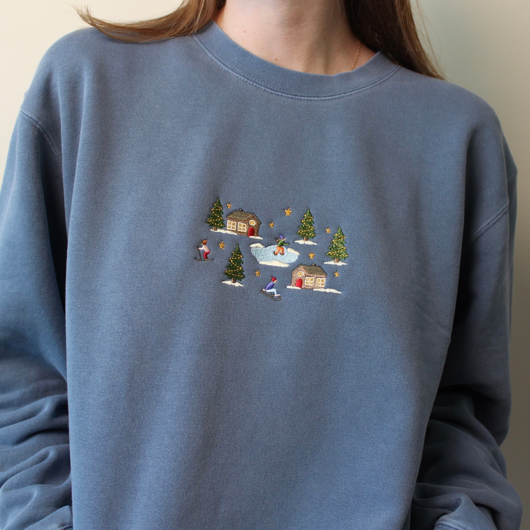 Bring back the magic of a 90s Christmas with this delicately embroidered winter village crewneck. Twinkling lights and cozy cabins are stitched with precision to capture the nostalgia of childhood holidays. The design feels soft, classic, and storybook-like, with charming details that invite you to look closer each time you wear it.