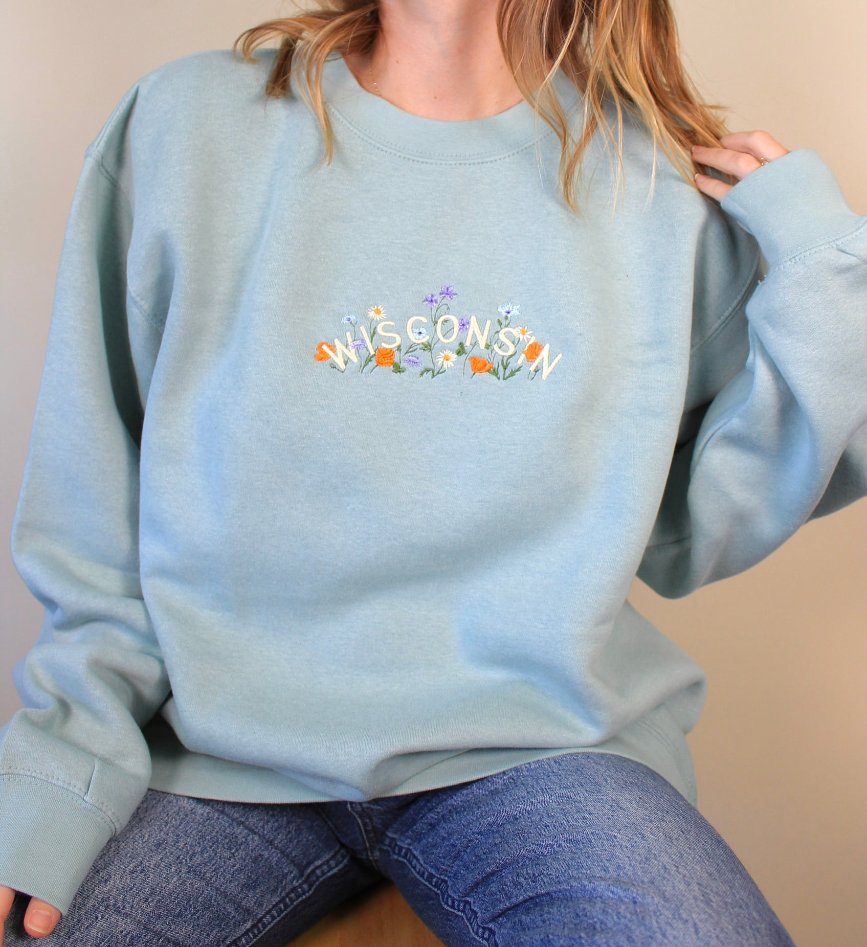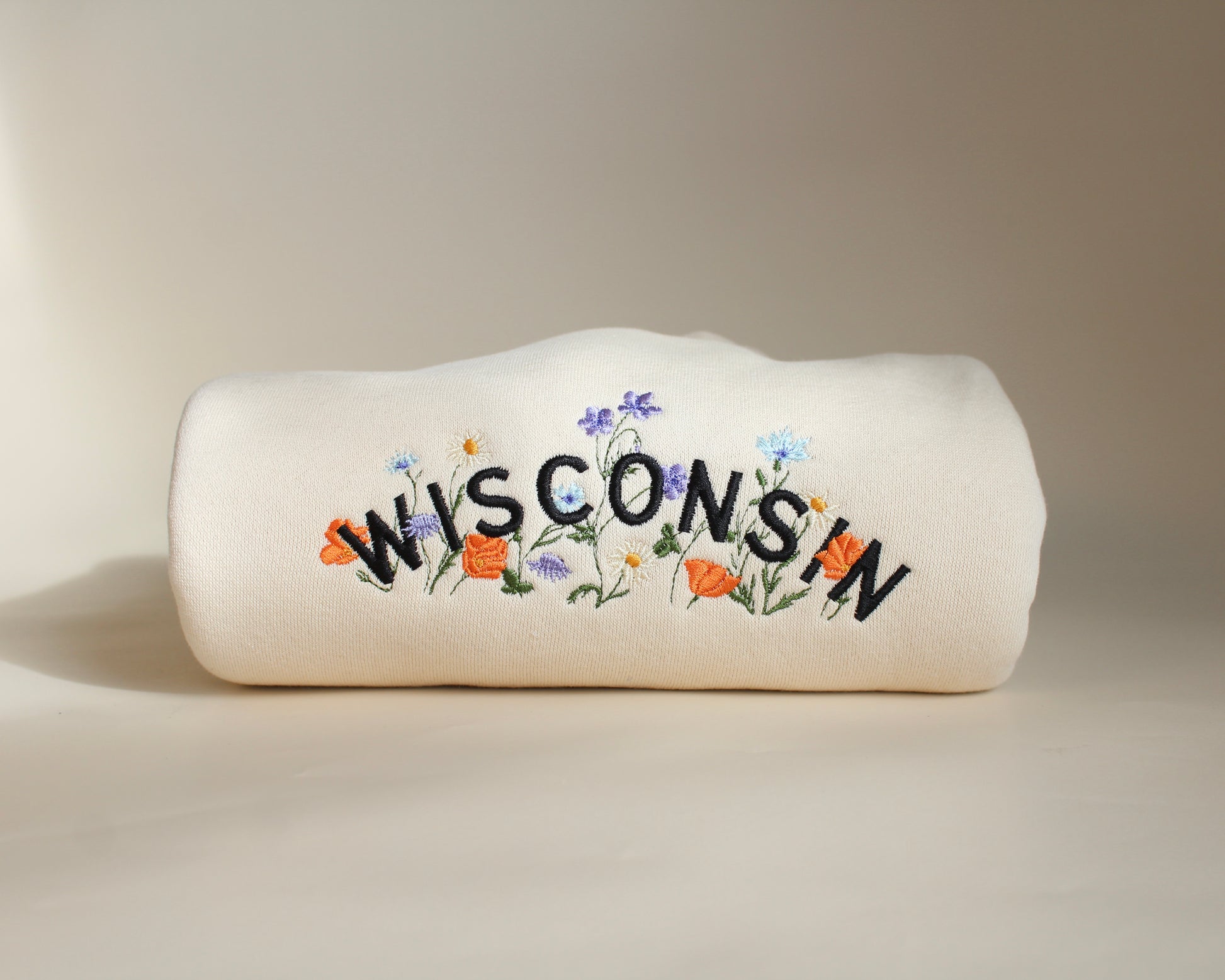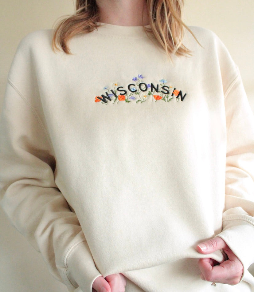 Wrap yourself in comfort and state pride with our embroidered Wisconsin Wildflower Crewneck. This ultra-soft sweatshirt features delicate, nature-inspired embroidery of "Wisconsin" surrounded by a charming arrangement of delicate wildflowers. Perfect for crisp mornings, cozy campfires, or simply showing off your love for the Badger State, this crewneck blends rustic Midwest charm with everyday comfort. See sizing and material details below.