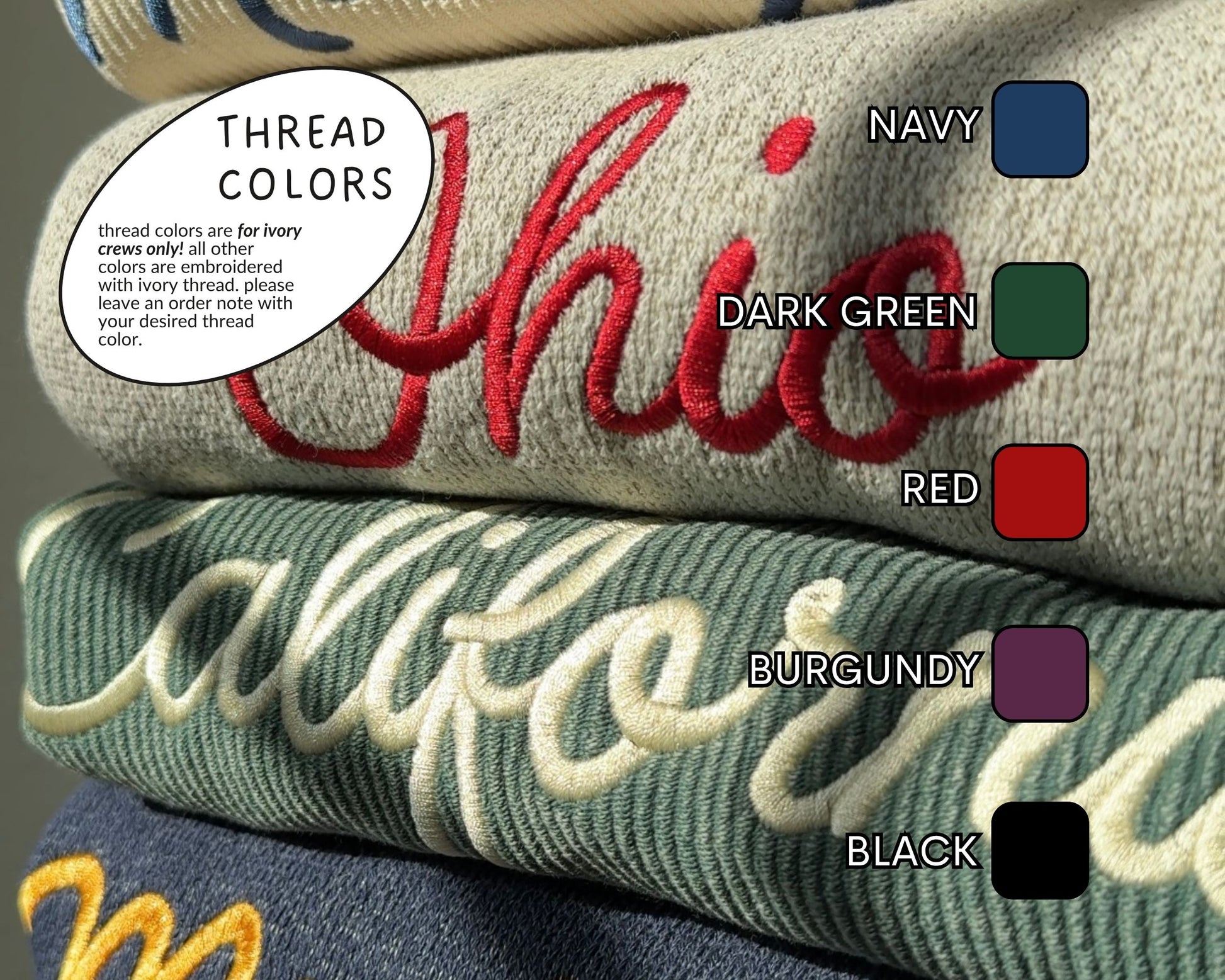 Green, burgundy, and navy crew colors will be embroidered with ivory thread. Want something more unique? Select the ivory crewneck and leave an order note with one of our available thread color options.